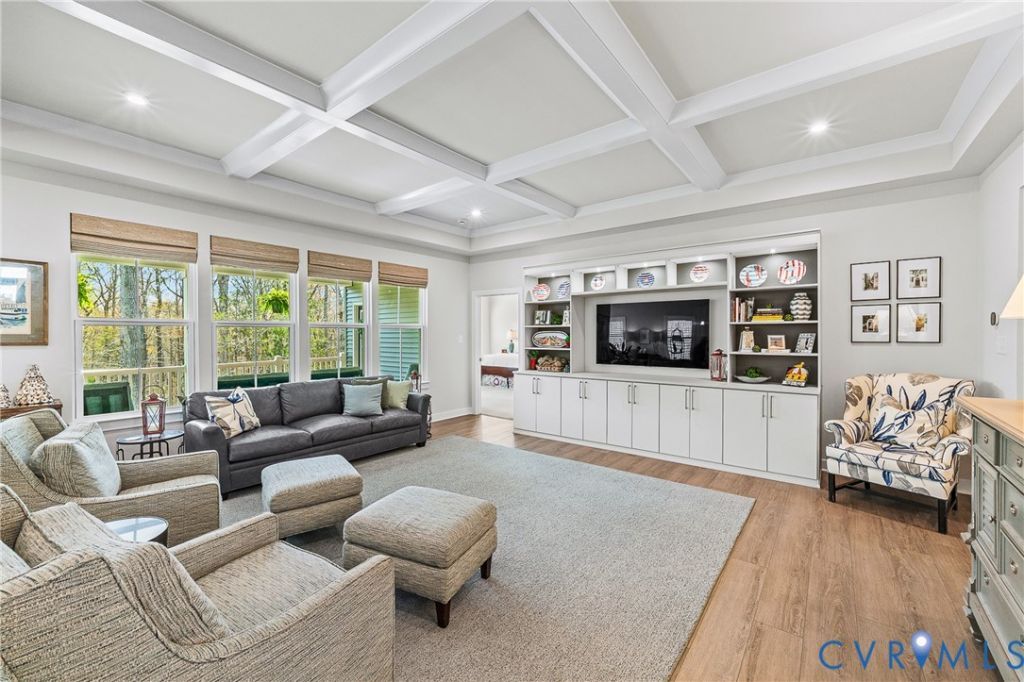 Experience refined living in this better-than-new residence, thoughtfully crafted just two years ago. Positioned within the sought-after, maintenance-free Charleston Club of Magnolia Green, this home offers an effortless blend of sophistication and comfort. From the moment you enter, you're welcomed by an airy, open-concept layout bathed in natural light. The stunning family room serves as a true focal point, featuring elegant coffered ceilings, custom illuminated built-ins, and a wall of windows that frame serene views of a protected, wooded backdrop. The chef's kitchen is both stylish and functional, appointed with a generous center island, wall oven, upgraded glazed 42' cabinetry, designer tile backsplash, and abundant storage. The adjoining breakfast area is bright and inviting, with expansive windows and direct access to the covered rear porch-complete with Trex decking and dual ceiling fans-creating the perfect setting for relaxed outdoor living year-round. The primary suite is a private retreat, offering generous proportions, dual walk-in closets, and a spa-inspired ensuite featuring a tiled walk-in shower, double vanities, and a private water closet. Additional highlights include a freshly painted garage with premium epoxy flooring, and a beautifully finished basement designed for entertaining-ideal for a home theater, game room, fitness space, or lounge. A spacious fourth bedroom with a walk-in closet and a full bath provides exceptional flexibility for guests or extended living. Over 800 square feet of unfinished basement space offers endless possibilities for customization. Enjoy peace of mind with a protected wooded area behind the home and a tranquil retaining pond nearby-enhancing both privacy and natural beauty. Charleston Club residents benefit from an exclusive, low-maintenance lifestyle, including private community amenities and events, along with access to Magnolia Green's premier offerings: championship golf, resort-style pools, tennis courts, clubhouse, scenic walking trails, and more.